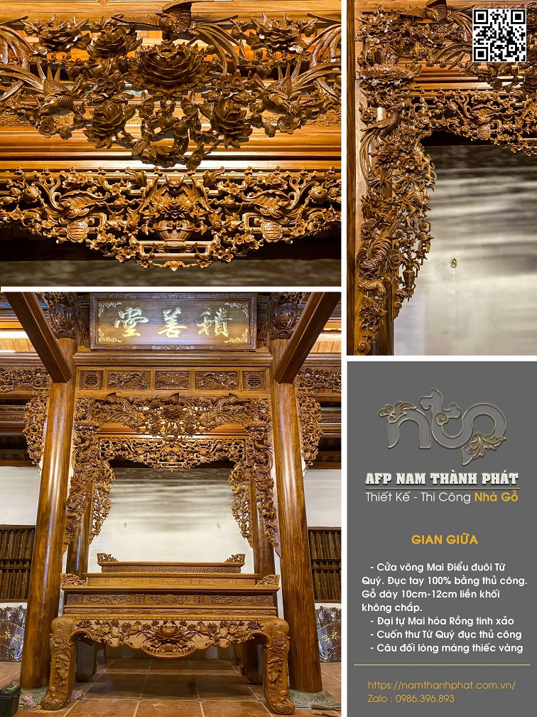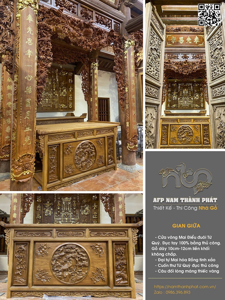 Nội thất phòng thờ đẹp vừa được đội ngũ thợ Nhà gỗ AFP Nam Thành Phát lắp đặt hoàn thiện cho gia chủ tại Đông Anh, Hà Nội. Đây là không gian được gia chủ đầu tư và chăm chút kỹ lưỡng nhất từ khâu chọn mẫu mã, chọn gỗ đến khâu nghiệm thu sản phẩm. Anh cho rằng gian thờ là nơi tôn nghiêm, linh thiêng do đó cần phải làm thật cẩn thận chu đáo, thể hiện được lòng thành kính của gia đình. Vì thế anh không ngần ngại chọn chất liệu gỗ tốt cùng những mẫu nội thất đồ thờ đẹp nhất tại Nam Thành Phát. Mẫu cửa võng mai điểu đuôi tứ quý đục tay thủ công 100%, từng hoa văn chi tiết bay bổng, mềm mại thể hiện được bàn tay khéo léo tài ba của các bác thợ làng nghề tại Hải Hậu, Nam Định.