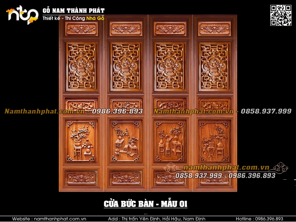 Mẫu 01: Cửa bức bàn với lá pano to phía trên mẫu triện bình hoa đặc. Lá pano to phía dưới mẫu cổ đồ.