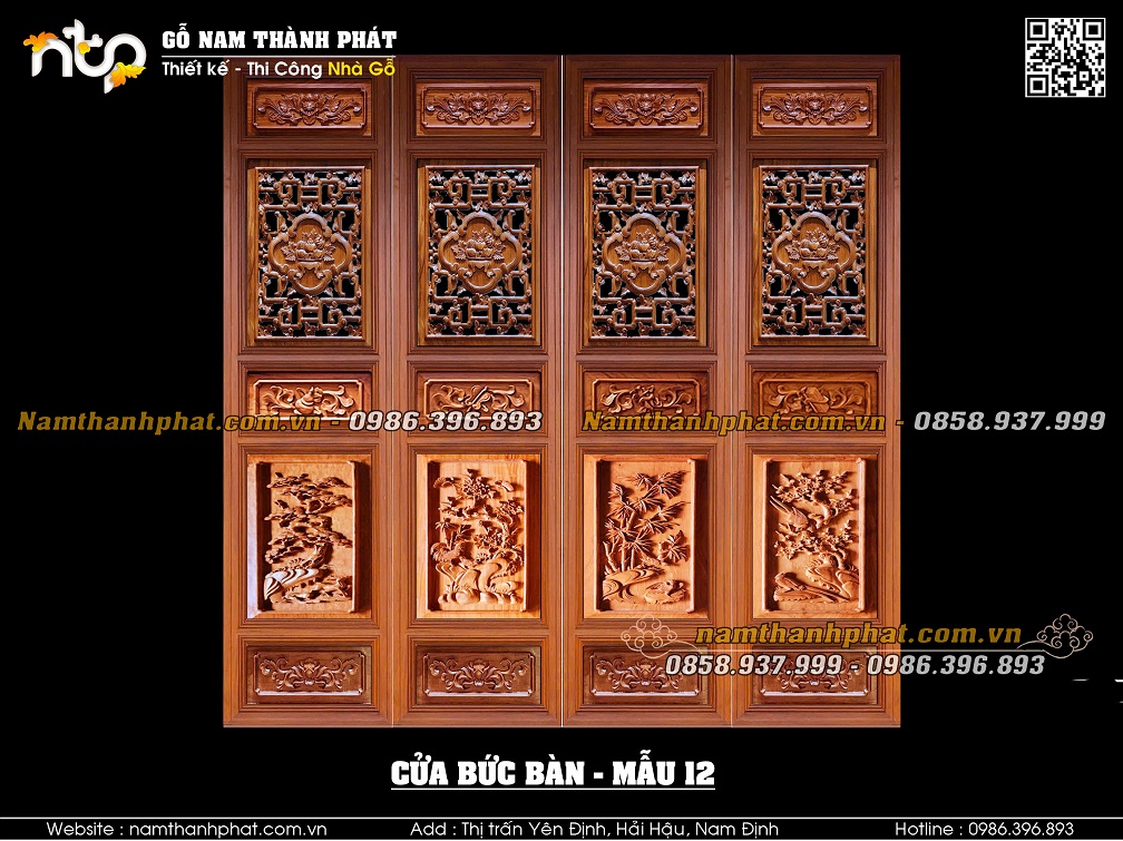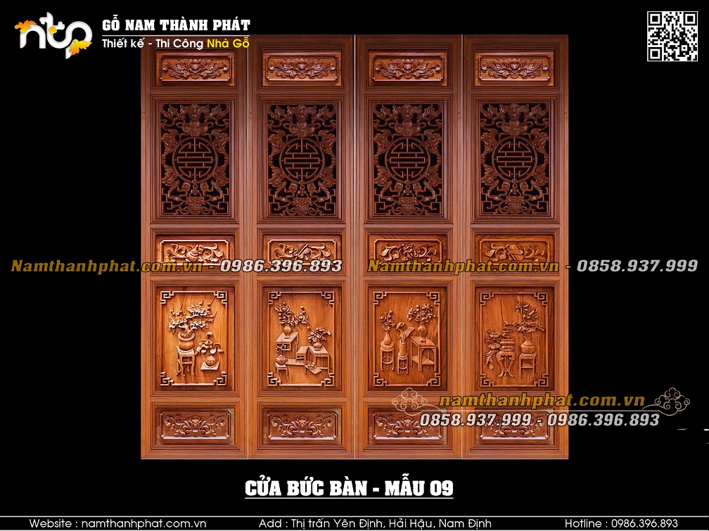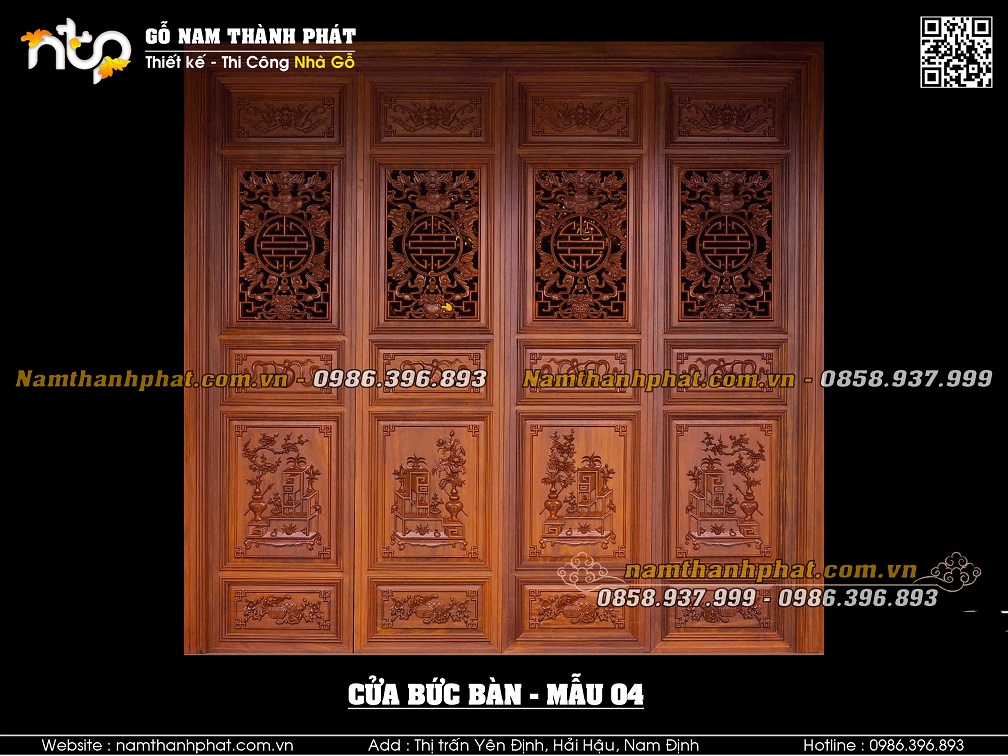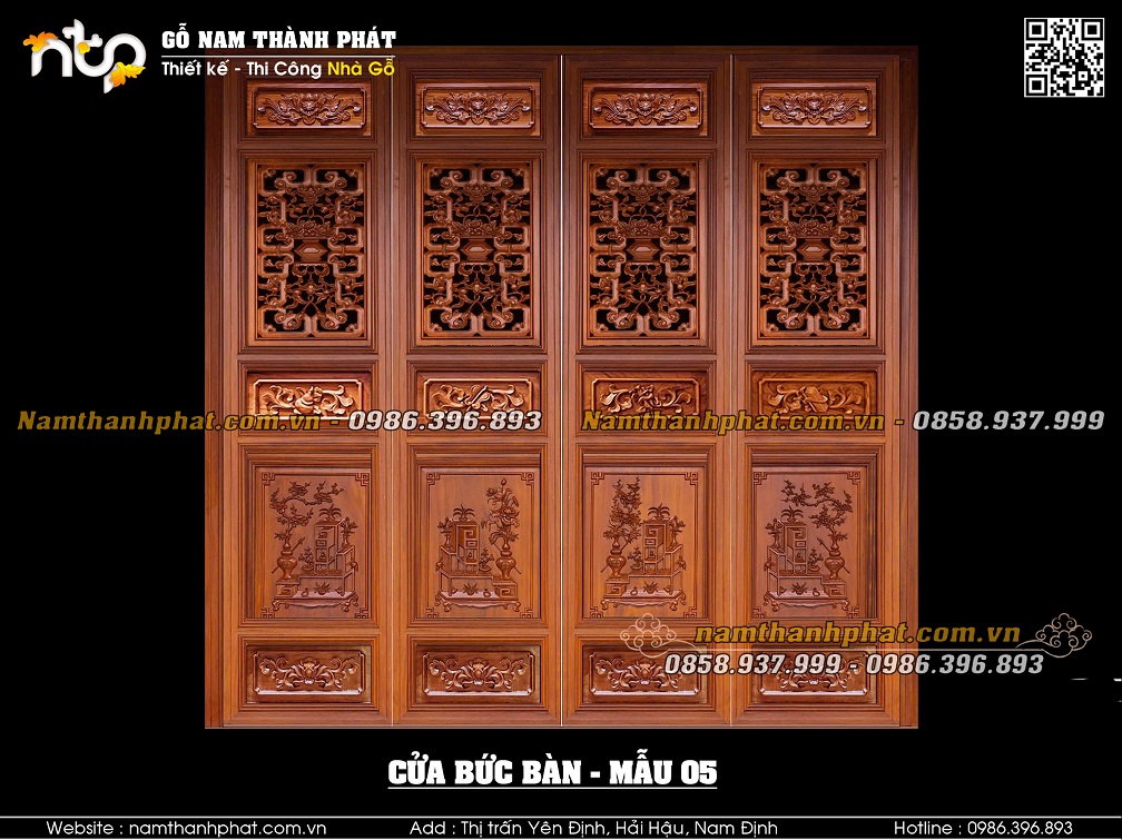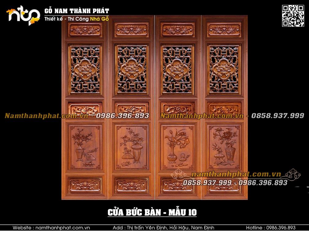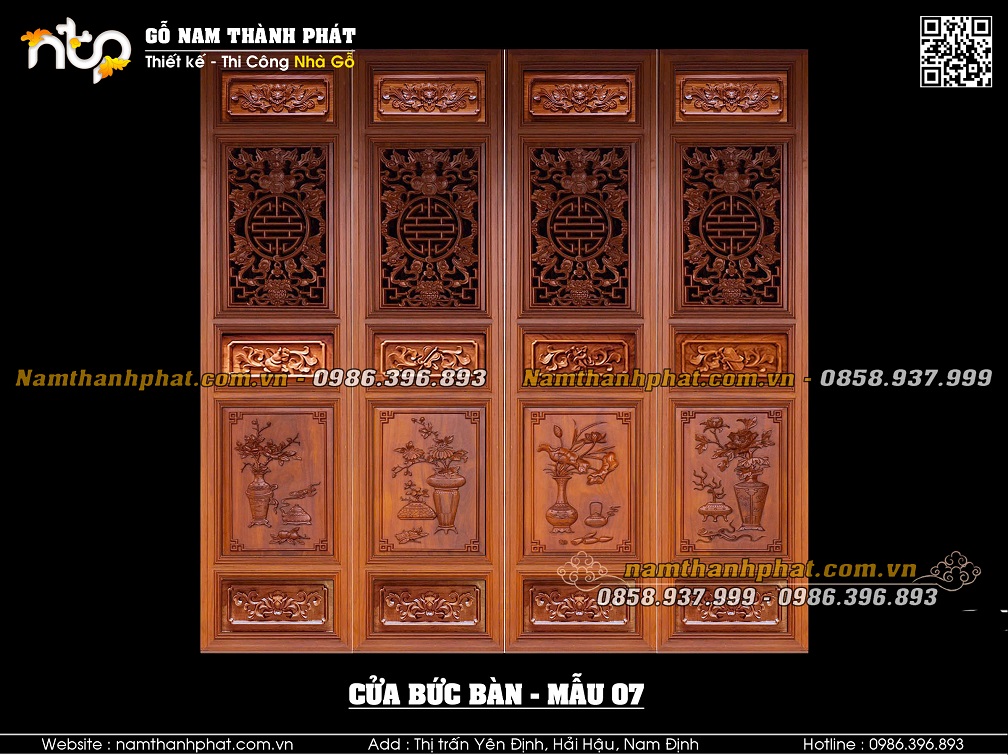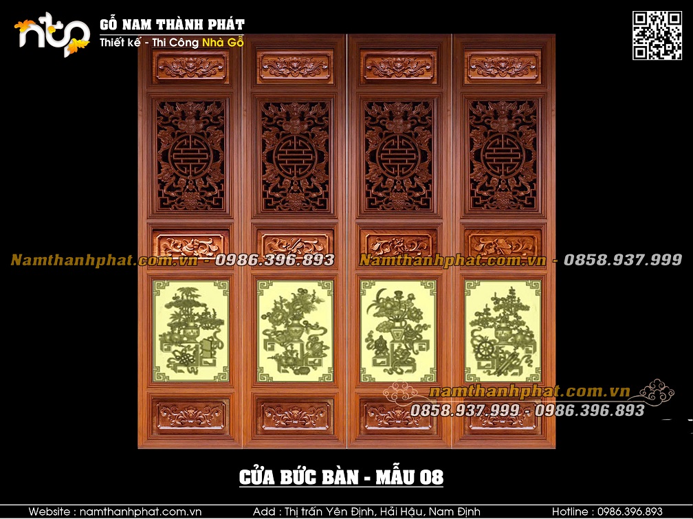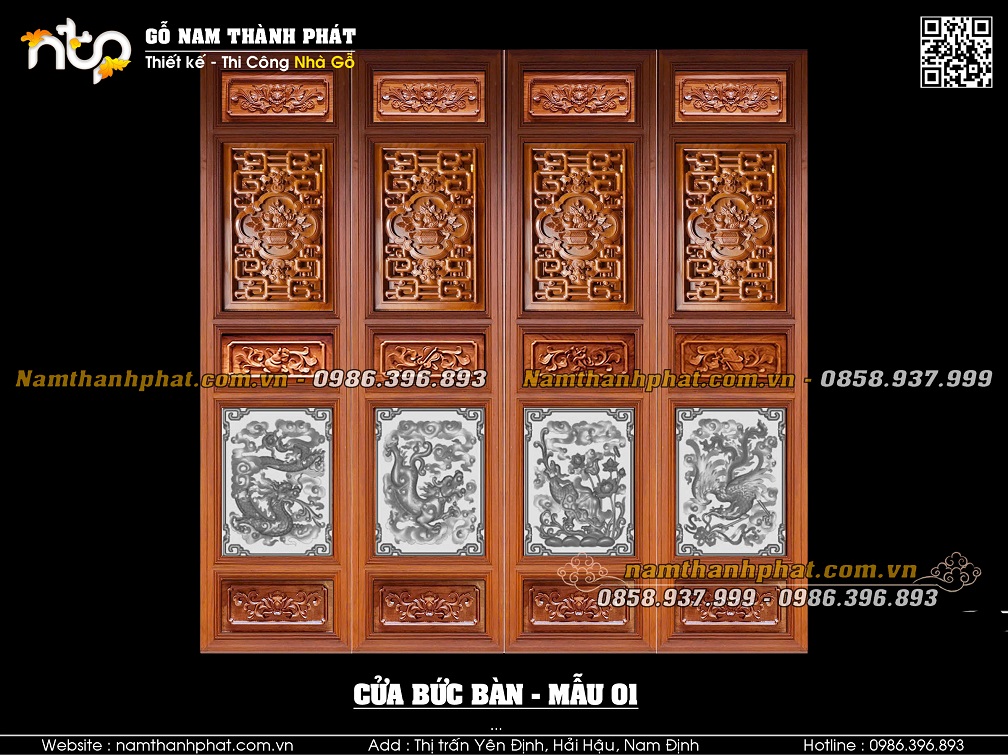 Mẫu 03: Cửa bức bàn với lá pano phía trên mẫu triện bình hoa đặc. Lá pano phía dưới mẫu Tứ linh.