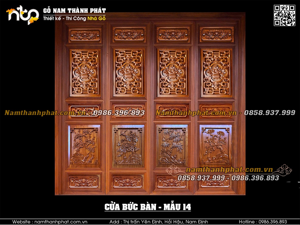 Mẫu 02: Mẫu cửa bức bàn với lá pano phía trên đục mẫu Tứ quý thủng. Lá pano to phía dưới mẫu cổ đồ.