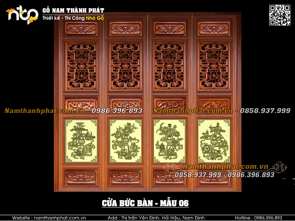 Mẫu 06: Cửa bức bàn với lá pano phía trên mẫu triện bình hoa thủng. Lá pano phía dưới mẫu Tứ bình.