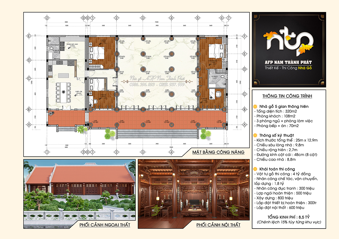 Ảnh thiết kế bao gồm mặt bằng công năng, 3D ngoại thất và 3D nội thất nhà gỗ 5gian