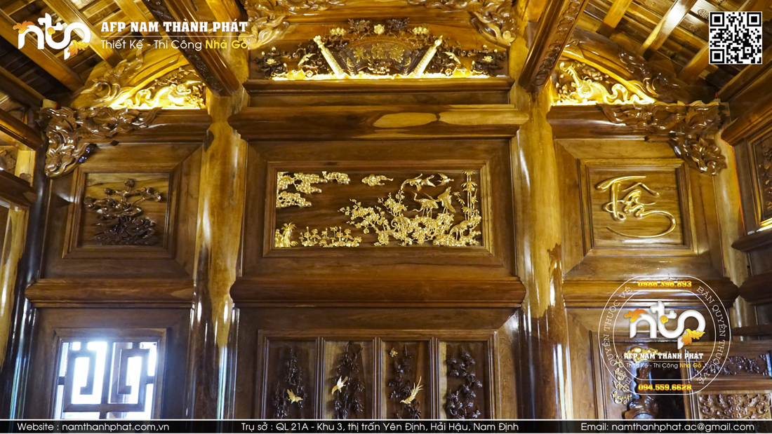 Căn nhà gỗ 3 gian với 3 bộ cửa bức bàn 4 cánh đều được đục chạm tinh xảo. Lá Pano trên là lô đục ngũ phúc lâm môn thủng hai mặt phần chữ Thọ với biểu tượng 5 con dơi kết lại, xếp thành vòng tròn ở giữa là chữ thọ, có ý nghĩa là 5 loại phúc cùng đến cửa nhà, mang nhiều phước lộc đến gia chủ. Lá pano dưới là mẫu Tứ quý Tùng Cúc Trúc Mai - thể hiện sự luân chuyển của bốn mùa xuân, hạ, thu, đông. Sự vận động của thiên nhiên không chỉ đem lại may mắn cho con người, mà còn là sự hy vọng, ước mong về một cuộc sống suôn sẻ, thịnh vượng.