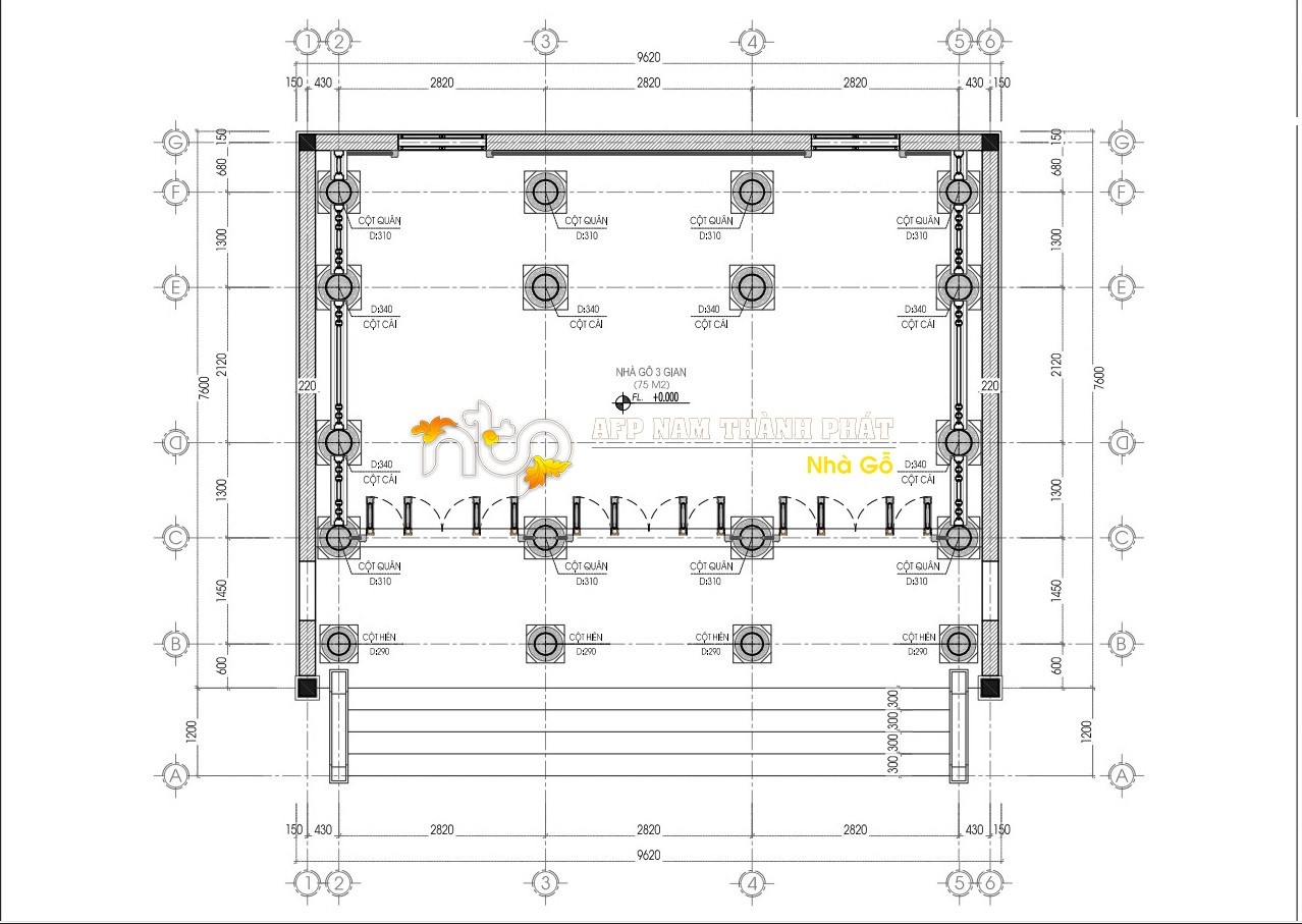 - Nhà gỗ 3 gian diện tích 75m2, kích thước phủ bì: 9,62m*7,6m (chưa tính tam cấp), trong đó 3 gian kích thước đều nhau là 2,82m.