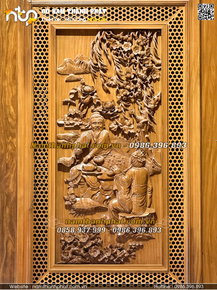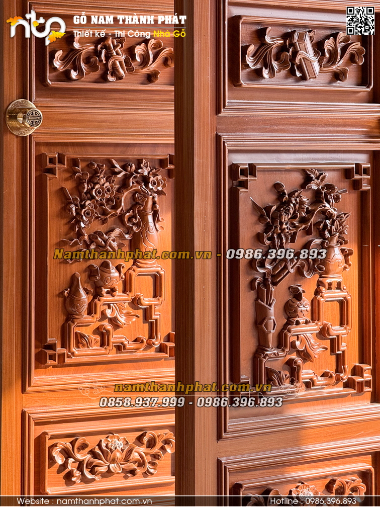 Trên từng cánh cửa là các bức chạm chủ đề chữ Thọ, hoa lá, đồ vật cổ… thể hiện sự trường tồn, phúc lộc và vẻ đẹp nghệ thuật.