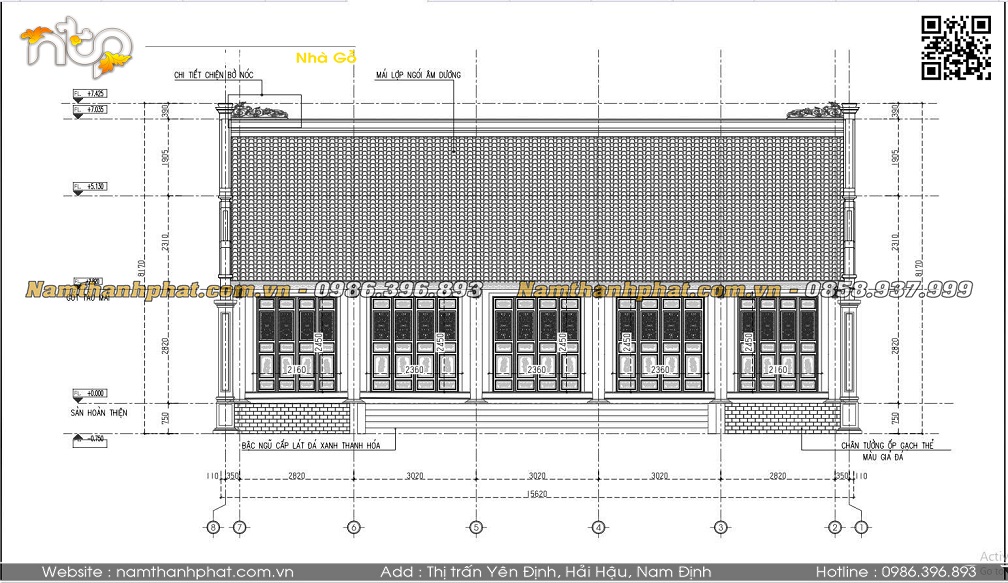 Bản vẽ mặt đứng nhà gỗ 5 gian.