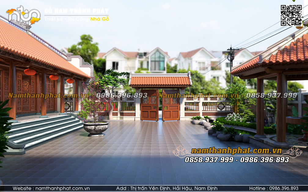 Khoảng sân lát gạch rộng rãi, chống trơn trượt. Đây cũng là khoảng đệm tạo sự tôn nghiêm cho nhà gỗ 5 gian. Đặc biệt với các gia đình của các bác trưởng tộc ở quê thì khoảng sân này là vô cùng cần thiết. Vì thường xuyên tổ chức giỗ chạp, lễ tết đông người cần sinh hoạt ăn uống ngoài trời.