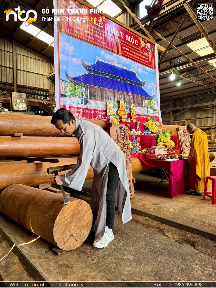 Gia chủ đang tiến hành nghi lễ phạt mộc công trình nhà gỗ 5 gian 2 chái chồng diêm gỗ Căm xe Lào siêu khủng, cột cái đường kính 45cm.