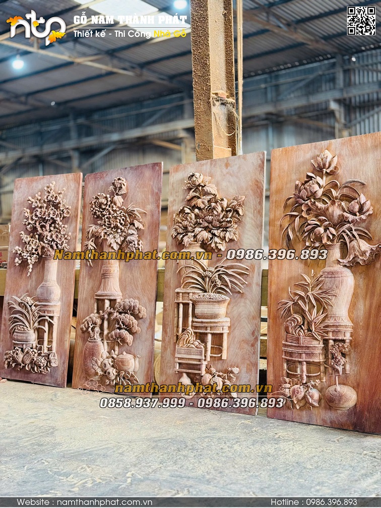 Bộ tranh Tứ bình trên vách thuận nhà gỗ làm bằng gỗ căm xe Lào đục chạm thủ công nền sâu, kênh bong sắc nét ấn tượng.
