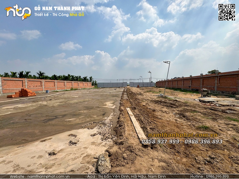 Công tác san lấp mặt bằng và xây dựng cổng tường rào kiên cố - chuẩn bị cho quá trình lắp dựng công trình nhà gỗ 5 gian 2 chái.