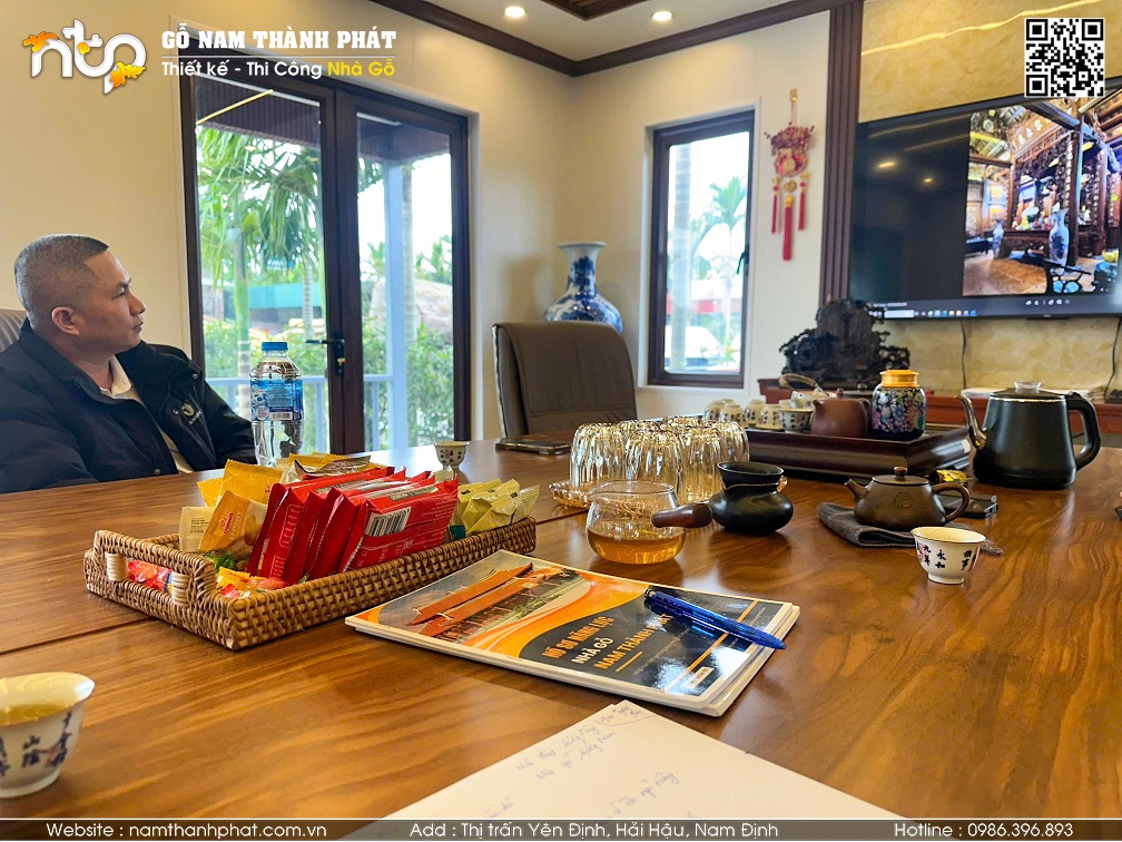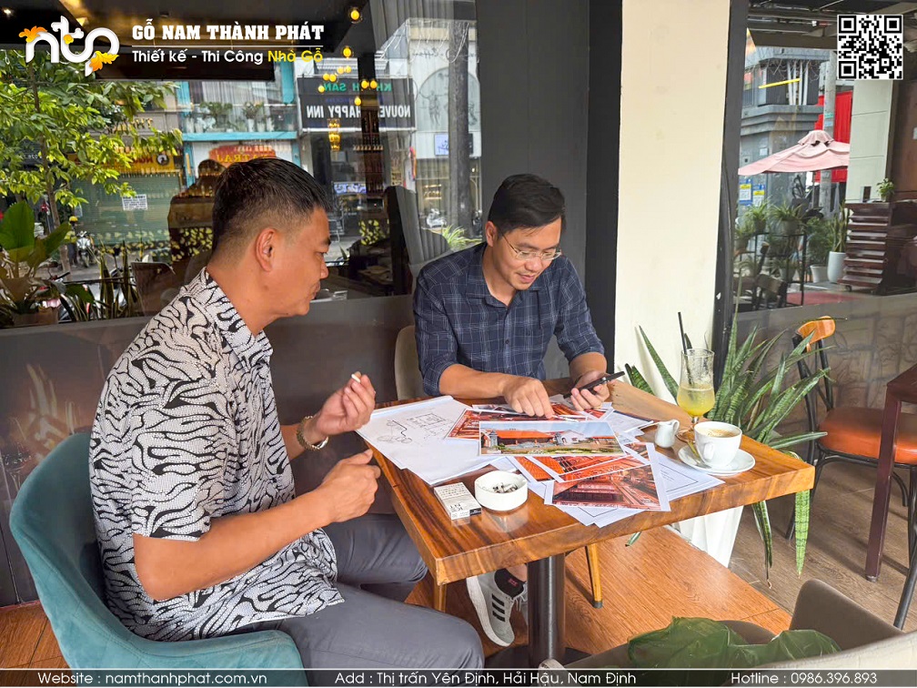 Hoạt động tiếp đón khách hàng diễn ra thường xuyên tại văn phòng và Xưởng Nhà gỗ Nam Thành Phát. Quá trình trao đổi chi tiết sẽ giúp nhà đầu tư và đơn vị thiết kế thi công hiểu rõ nhau hơn: về sở thích, nhu cầu, phong cách kiến trúc... Quá trình làm việc rõ ràng, minh bạch cũng sẽ giúp CĐT tin tưởng và an tâm hơn hơn.